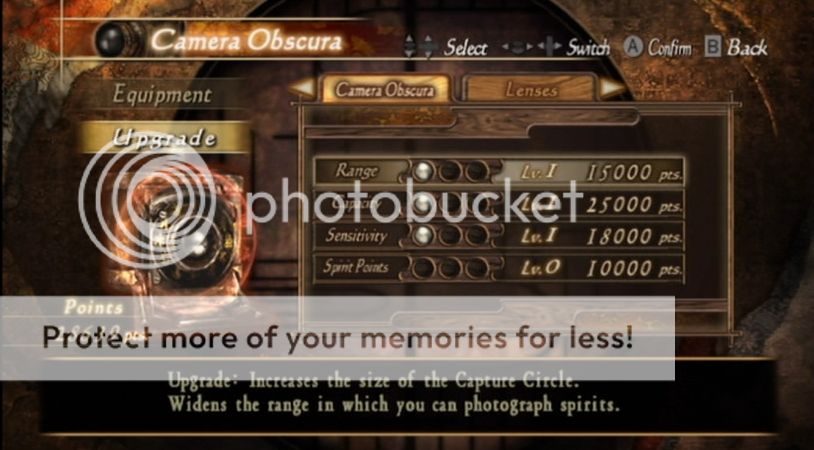 Ngoài ra, để đối phó với những con ma "cứng đầu" hơn sau này, chiếc camera có thể nâng cấp bằng cách dùng số điểm có được sau bị "nã đạn" vào ma và nhặt được các Spirit Stone rải rác trong game, và lắp thêm các lens và "function" hỗ trợ. Dần dần mình càng có cảm giác đây không phải là sản phẩm của cuối thế kỉ 18 đến đầu thế kỉ 19 và thế kỉ 20, có lẽ nó là loại camera của Doraemon ở thế kỉ 22 với các tính năng quen thuộc của các camera hiện đại hiện nay. Dù là máy phim cũ đơn giản nhưng có tính năng Face detection, auto focus, lock-on, radar, viewfinder điện tử hiển thị thông tin, chế độ chụp tự động chỉnh khẩu độ, tốc độ màn trập, zoom, ... Mother of camera obscura.