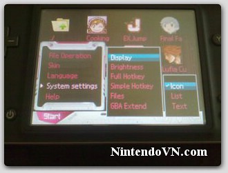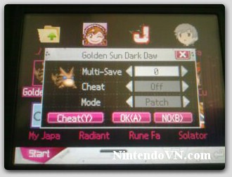 - Cheats : dùng định dạng file cheat là *.CHT, bạn có thể lấy cheat game trên web này(http://us.codejunkies.com/Departments/DS-and-GBA.aspx)