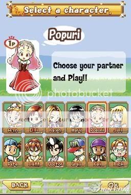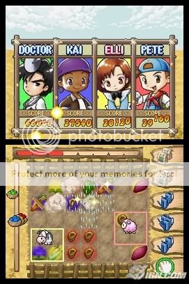 Thui, giờ nói đến vấn đề chính nhá. Một vấn đề quan-xì-trọng. Đó là…Đó chính là…là …cách chơi.^^ Bạn sẽ được wăng vào một mảnh ruộng cùng ba người khác. Đương nhiên là mới đầu chỉ có đất hông hà. Công việc dễ mà khó. Dễ vì bạn chỉ cần thực hiện những bước đã khá quen thuộc trong dòng Harvest Moon lên mảnh đất đó: cuốc, tưới, gieo hạt, thu họach. Xin nhắc là những bước này làm bằng stylus nhá. Khó vì phải cùng lúc cạnh tranh với 3 nhân vật khác trên cùng một thẻo đất con con trong một khỏang thời gian nhất định. Bạn sẽ phải làm sao bảo vệ cây của mình, đồng thời tích cực cầm nhầm đồ thu họach của người khác. Sẽ có một thang đo mức độ thu họach của các nhân vật, ai lên đến đỉnh trước là thắng. Ah! Quên nữa. Màn hình cảm ứng thì dùng làm nơi cuộc đấu diễn ra, còn màn hình trên thì để ảnh đại diện của cácnhân vật tham gia trận đấu kèm số điểm bên dưới (tương ứng với thanh thứ hạng). Mấy hình này ngòai đẹp ra còn biểu hiện sự vui bùn khi nhân vật đó lên hay xuống hạng trong cuộc đua. Trở về hướng đi chính nào. Mảnh ruộng 4 người cùng canh tác lại càng thêm hỗn loạn khi có sự tham gia của vật nuôi. Đủ lọai chó, bò, gà, cừu… được các nhân vật thả ra chạy lung tung. Nhưng sẽ là ngu ngố nếu không thả chúng ra. Đơn giản vì mỗi lọai lại có một tác dụng đặc biệt hỗ trợ công việc của người tham gia cuộc đấu. Như bảo vệ cây của người thả ra. Rất may tác dụng đó không kéo dài mải và không xảy ra trên tòan mảnh ruộng mà chỉ trong một phạm vi hẹp. ^^ Đó cách chơi chỉ có vậy thui. Đơn giản hén nhưng cũng chẳng dễ đâu. Bạn cũng có thể đấu với người khác nhờ khả năng kết nối hông dây của DS.