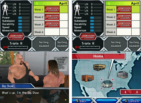 Cái này nên chơi nha, di chuyển = D-pad + đòn đánh = touch screen, Finisher = L. Mới sơ qua cái mục tạo SuperStar mà đã có > 200 moves rồi :O:O. Phần quản lí hơi bị mệt nhg hay, từ novice trở thành superstar. Có $ để mua item hỗ trợ, vũ khí, thuốc ...