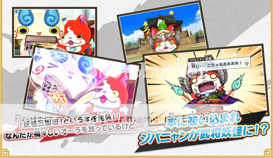 Mở đầu, Jibanyan, USApyon, và Komasan đang chung sống hòa bình với nhau. Một ngày kia, chúng tìm được một cuốn sách kỳ bí có tên Yo-kai Sangokushi (Yo-kai Romance of the Three Kingdoms) và bị hút vào bên trong. Thê giới bên trong sách đầy những điều kỳ thú, nhưng có một vấn đề: 3 Yo-kai đã bị chia cắt bởi một sức mạnh bí ẩn. Để trở lại thế giới cũ của mình, chúng lên đường đi tìm nhau. Và từ đó bắt đầu một chuyến phiêu lưu mới của những Yo-kai Watch khoác chiến bào.