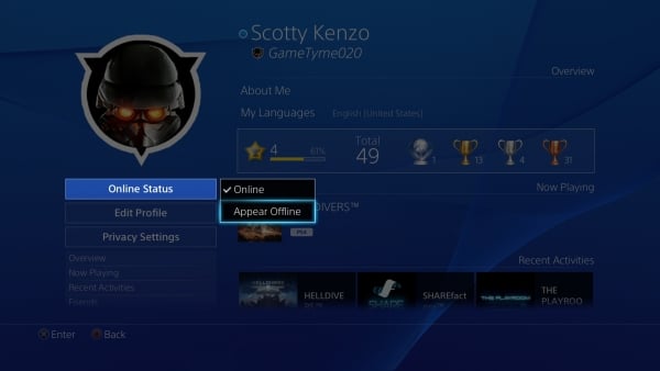 Đôi khi bạn muốn chơi game hay xem phim mà không bị người khác làm phiền. Việc đó sẽ dễ dàng hơn khi ẩn đi nhờ vào chức năng hiển thị mình đang offline. Bạn có thể chọn mình muốn ẩn theo dạng offline hay không khi đăng nhập vào máy hoặc bất kỳ lúc nào từ Profile hoặc Quick Menu.