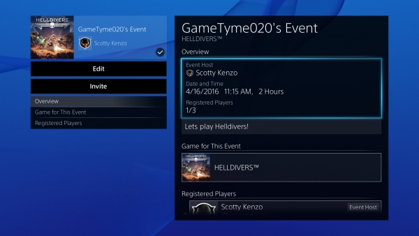 Sony đã thêm tính năng lên lịch các buổi chơi mạng trong tương lai của người dùng với bạn bè. Khi những sự kiện này bắt đầu, những người đã đăng ký tham gia sự kiện sẽ tự động được thêm vào nhóm, nhờ đó bạn có thể chơi game ngay lập tức.