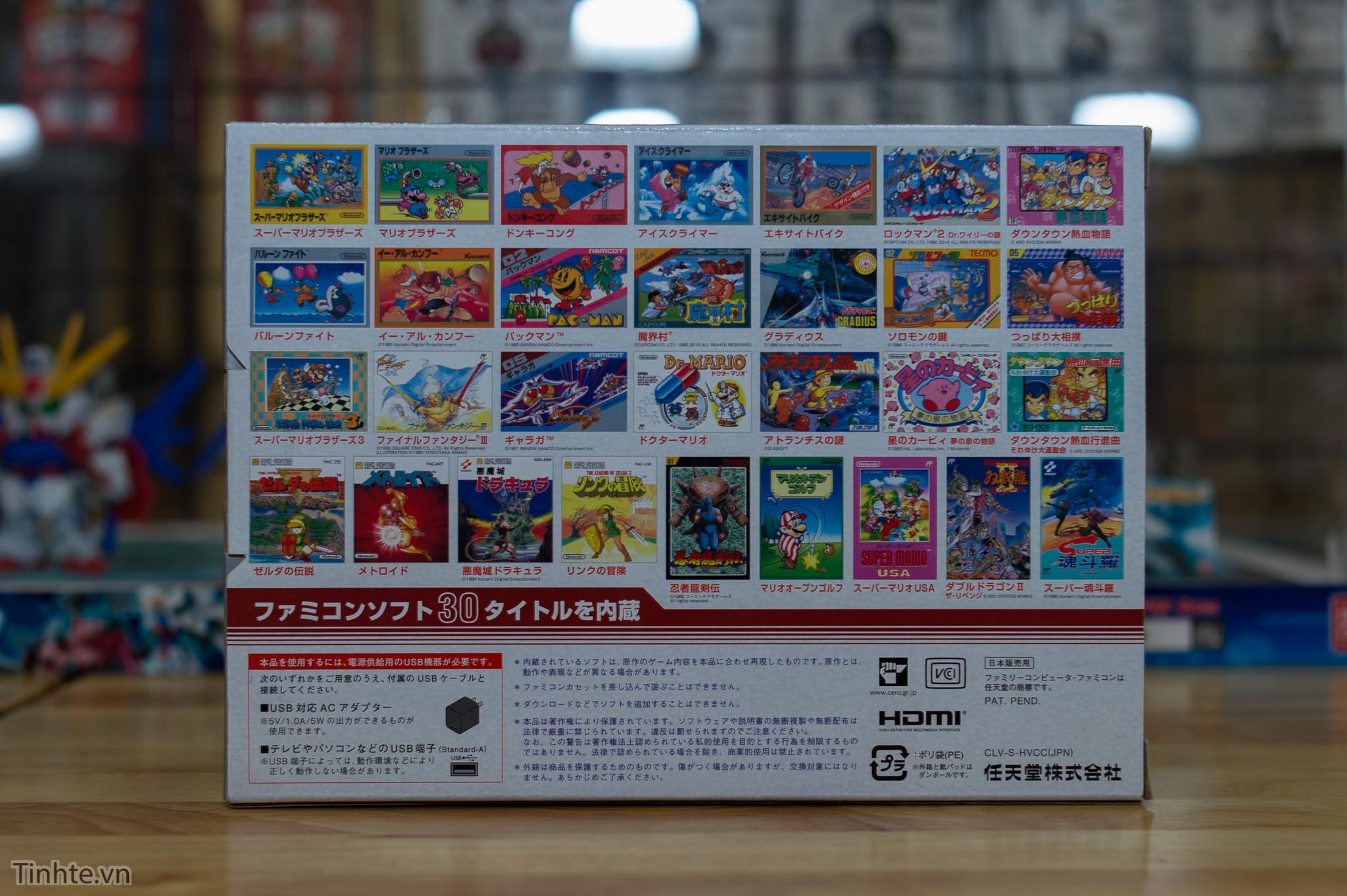 Mặt sau là 30 game được cài sẵn trong máy. Chúng ta có những tựa game một thời ăn sâu vào tiềm thức như ăn nấm (hoặc hái nấm) Mario, Rockman, Kirby, Dr. Mario,... Trong hộp chúng ta có máy với 2 tay bấm gắn chết vào, 1 cáp microUSB cấp nguồn cho máy và 1 cáp HDMI. Máy không có adapter sạc mà chỉ cần cắm thẳng cáp USB vào trong TV là xài được luôn.
