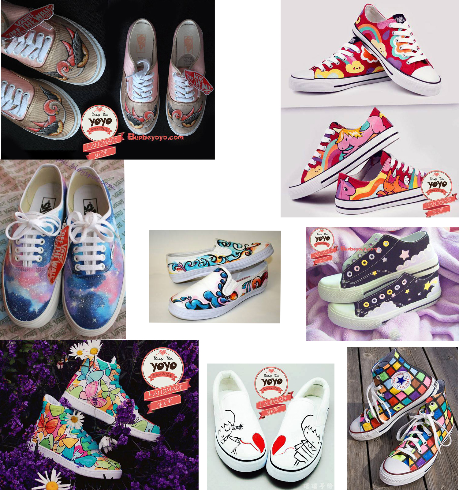 YoYo nhận vẽ giày Convers cổ thấp, Converse cổ cao, giày Vans, giày Toms, giày Hacene .. Các bạn có thể vào www.facebook.com/bupbeyoyo hoặc www.bupbeyoyo.com để xem thêm các mẫu. Các hoạt tiết vẽ được cập nhật theo thiên hướng thời trang, màu sắc chủ đạo theo các tập san thời trang nức tiếng.